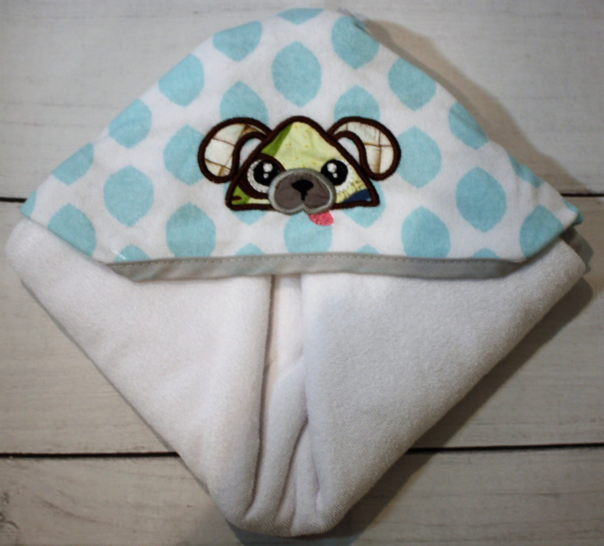 - Embroidery is sewn centered on the hood of the towel